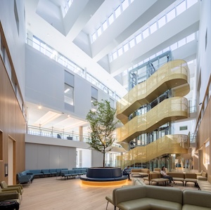 The children’s ward, located on the top floor, features a paediatric unit with single rooms offering views across the coast and surrounding forest. Flexible spaces support parents and carers to stay close to their children, while dedicated areas for schooling, recreation and social interaction help create a supportive and healing environment.